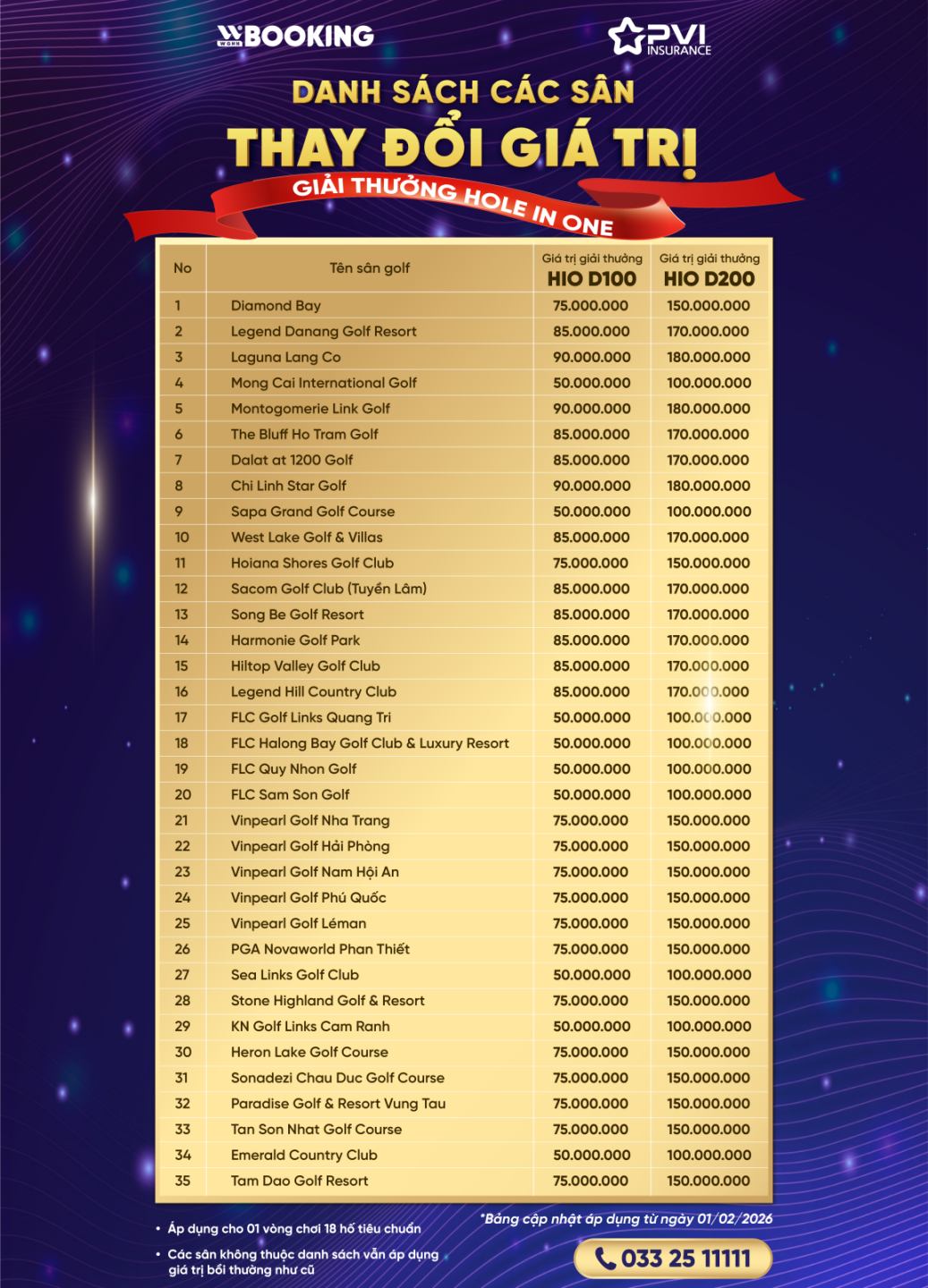 Wbooking thực hiện thay đổi giá trị giải thưởng (áp dụng đối với dịch vụ giải thưởng HIO theo lượt) của 20 sân golf như sau: